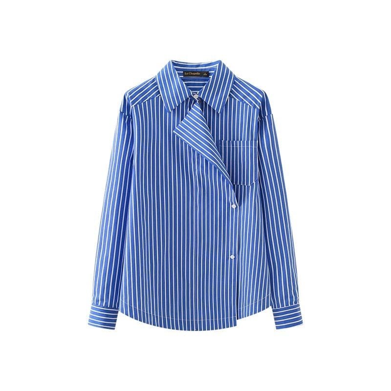 サイドボタンと鮮やかなストライプデザインが目を引くシャツ。