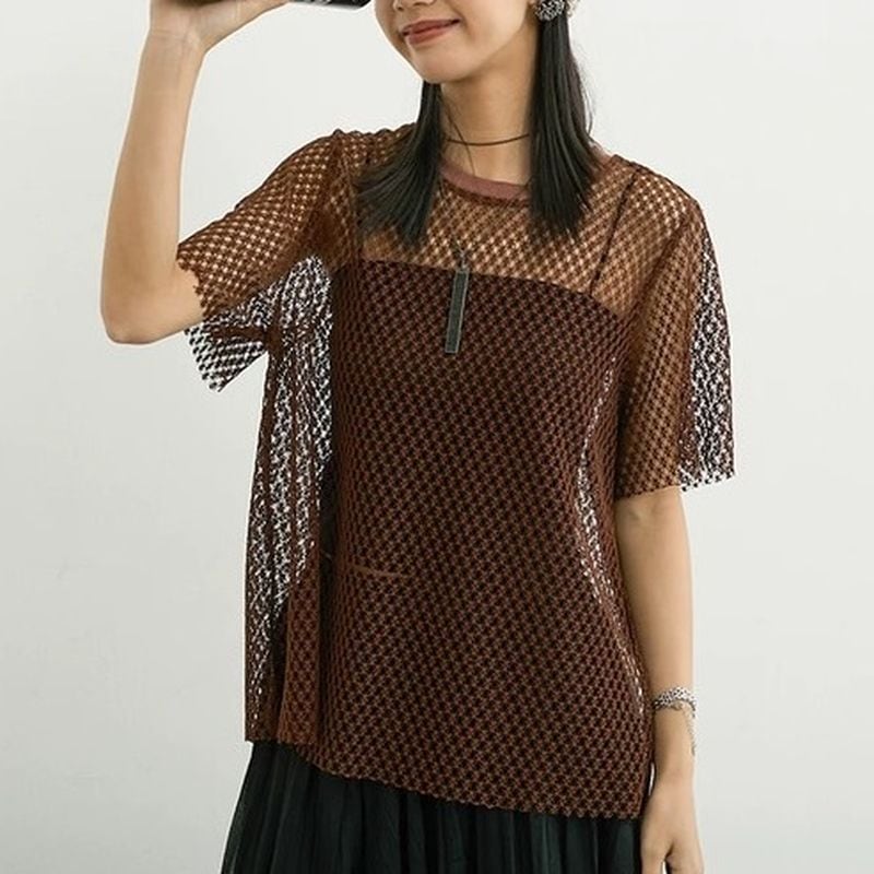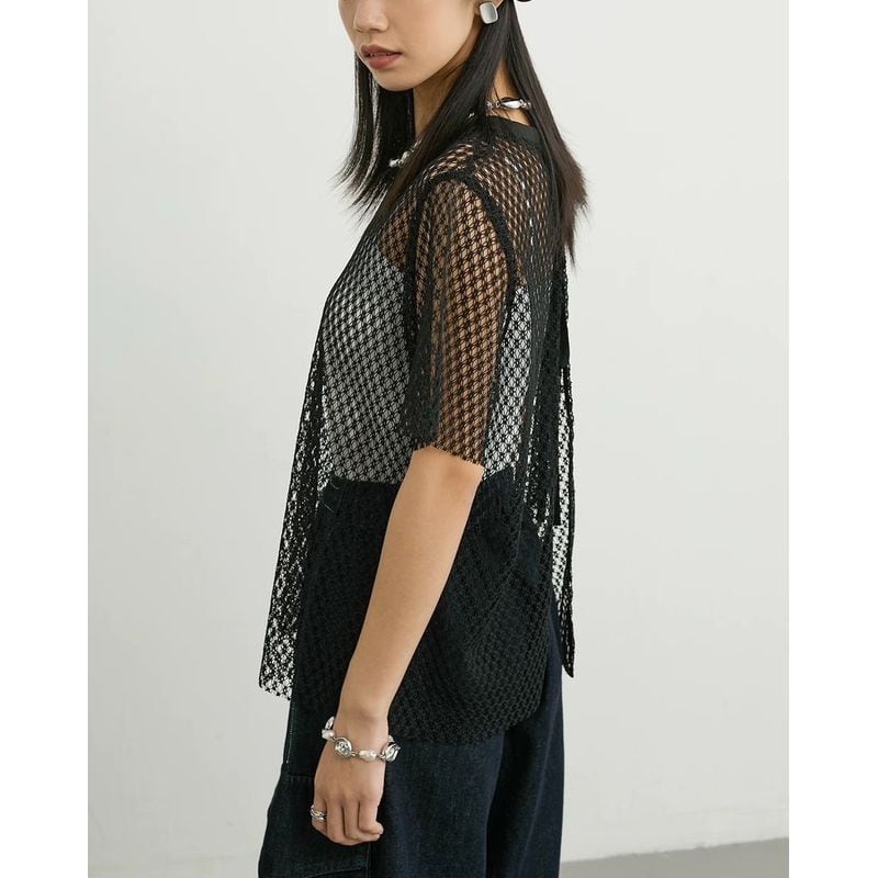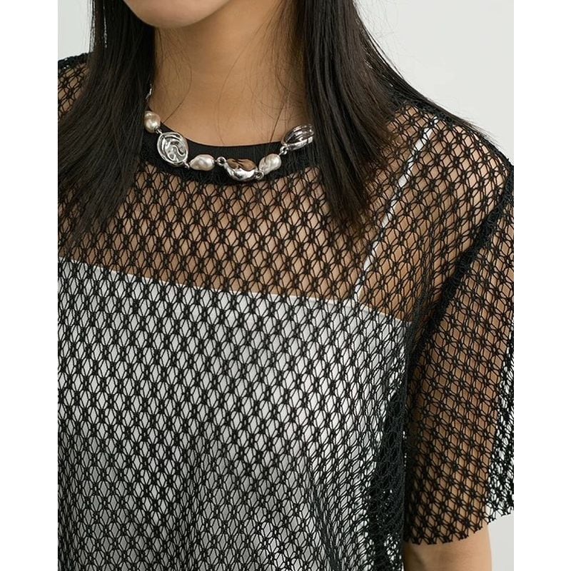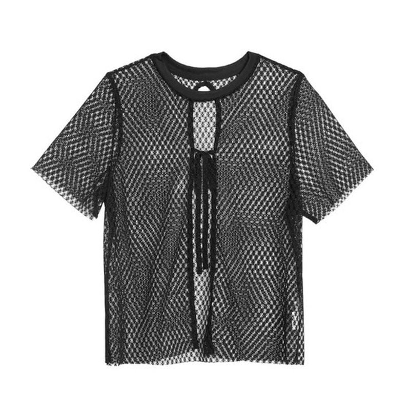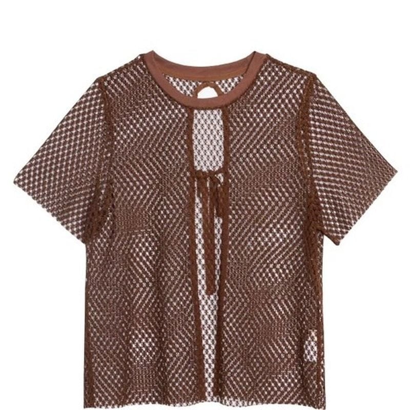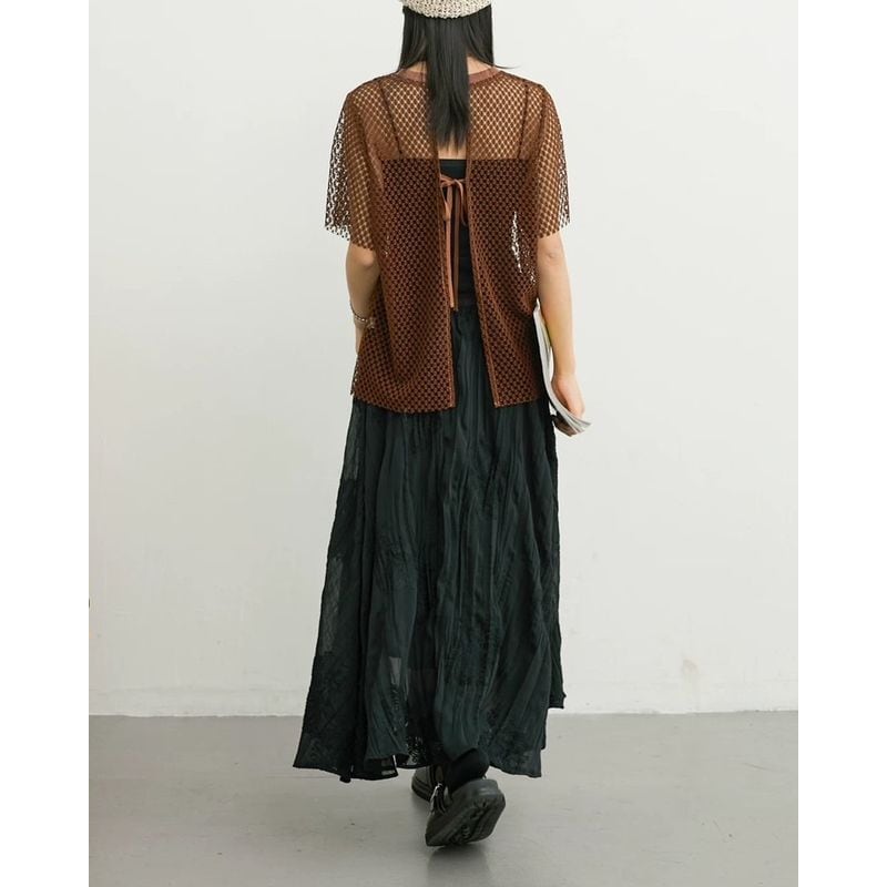 バックリボンデザインと、メッシュの肌の透け感が女性らしい着こなしを叶えてくれるトップス。