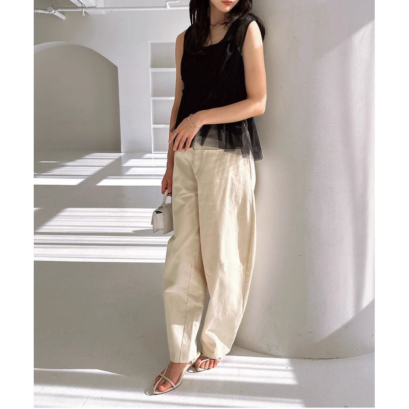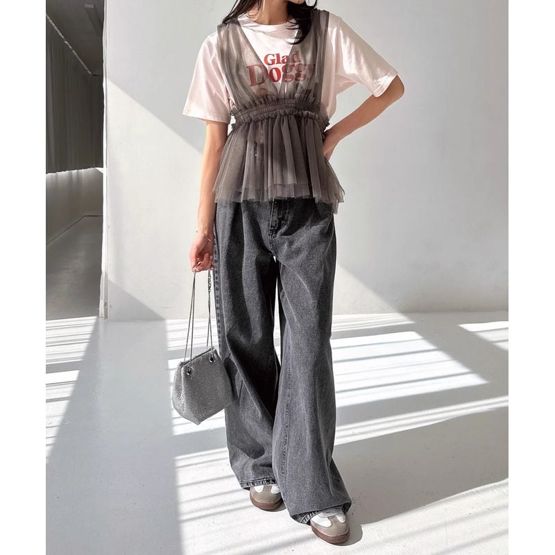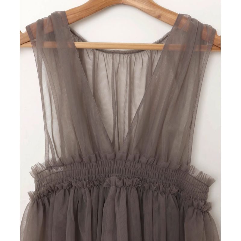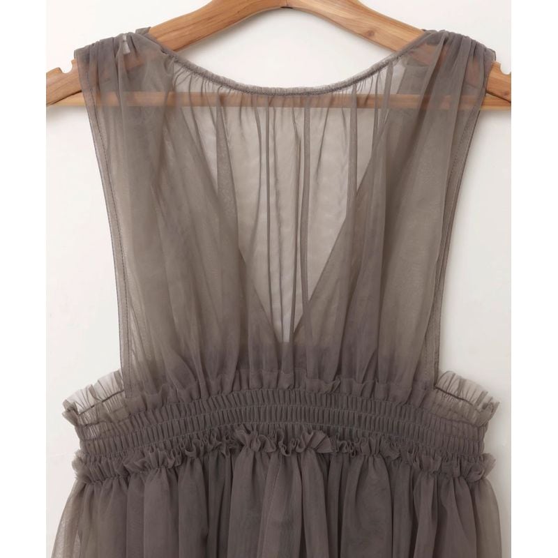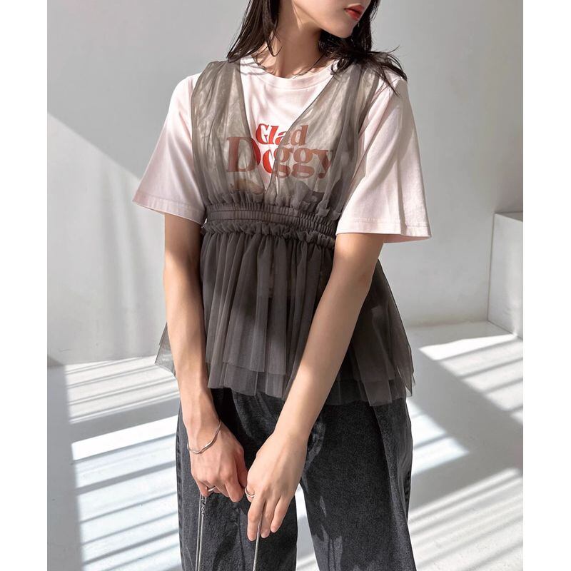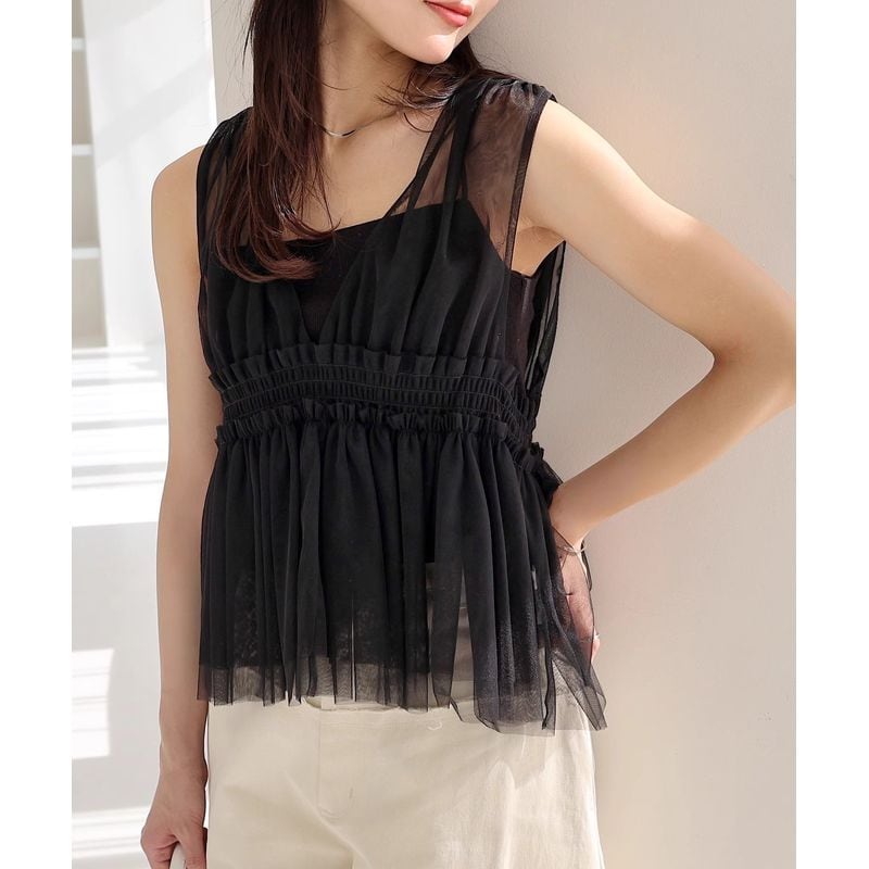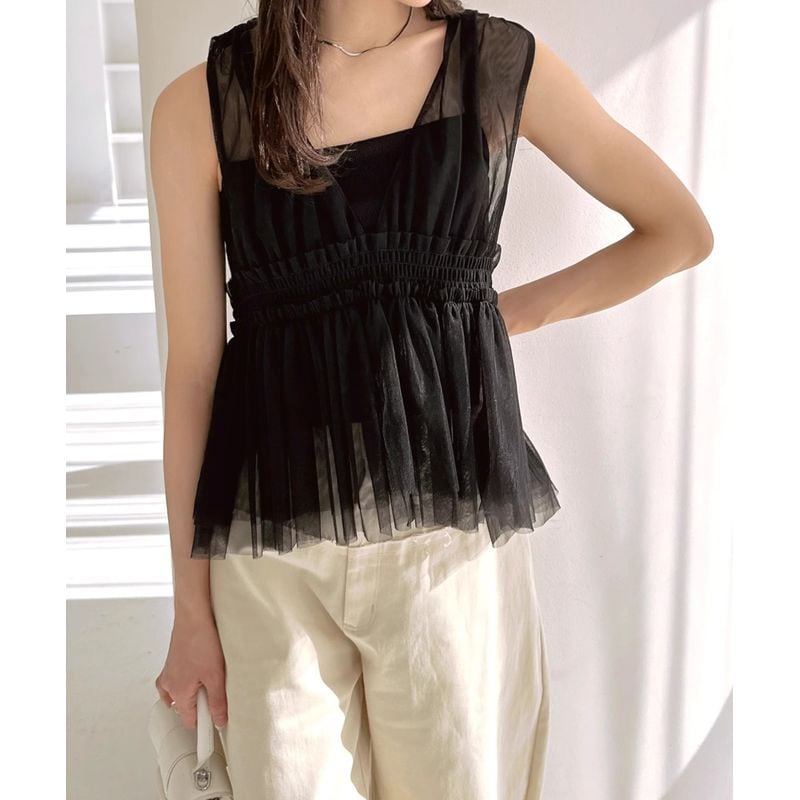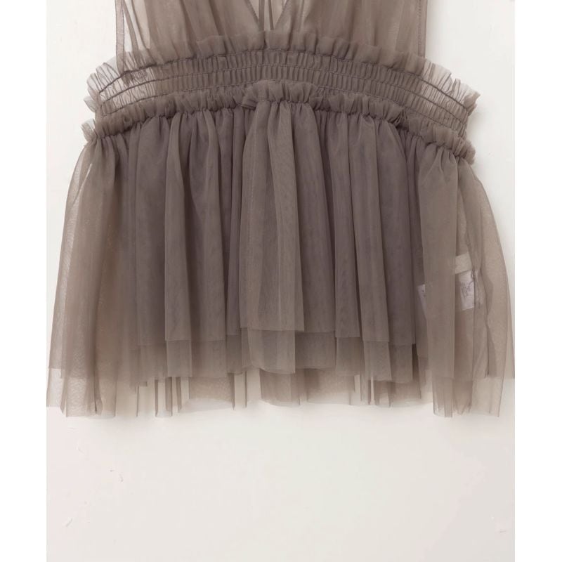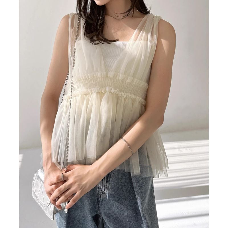チュールのフリル感が女性らしい着こなしを作ってくれる、Vネックデザインのビスチェ。