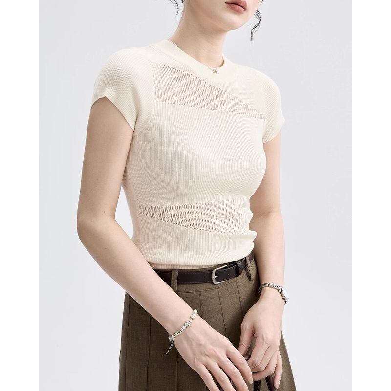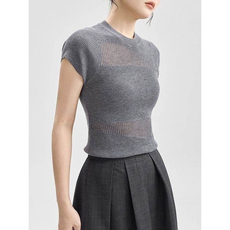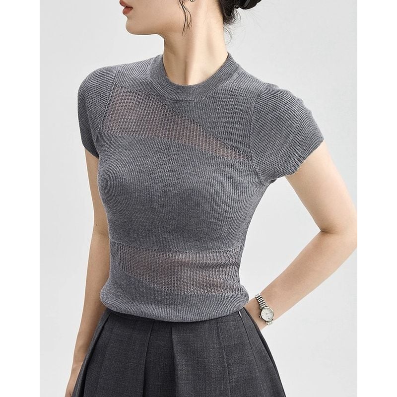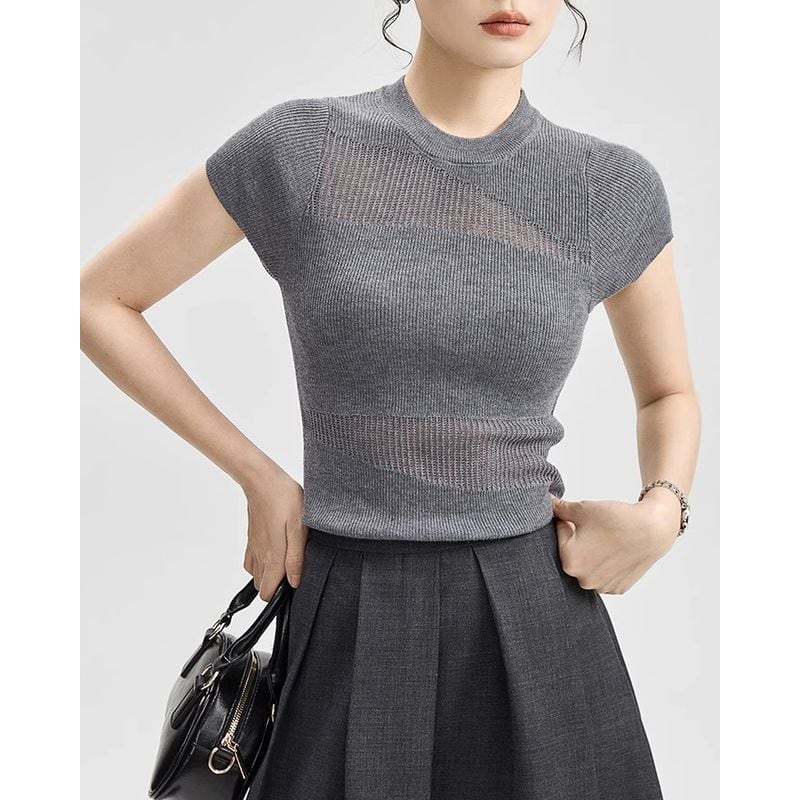 メッシュラインが上下に入った、1枚で着映えする半袖ニットプルオーバー。