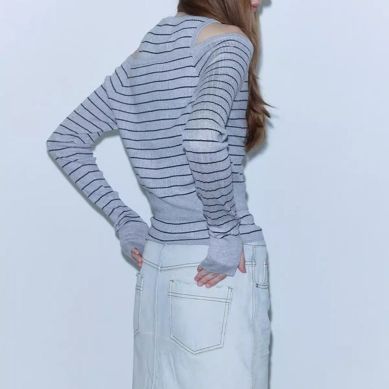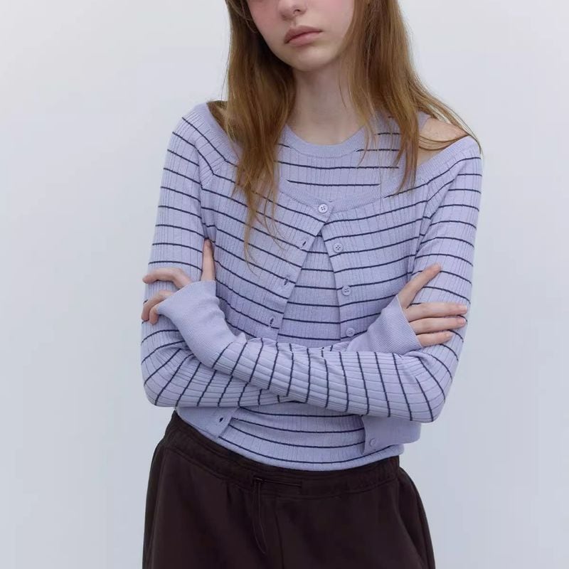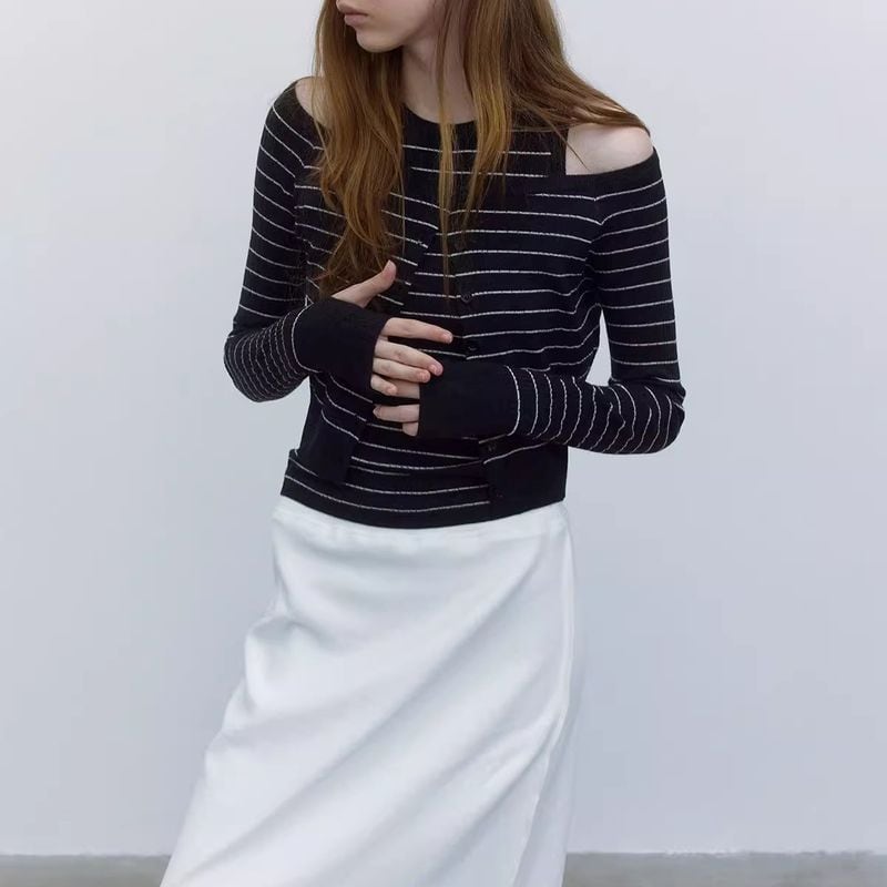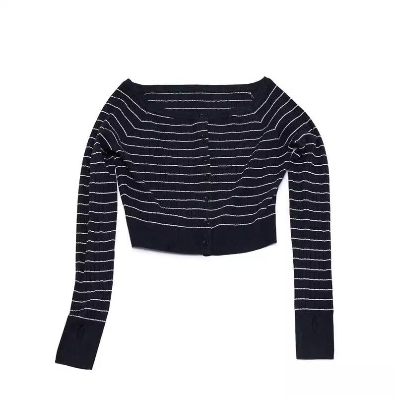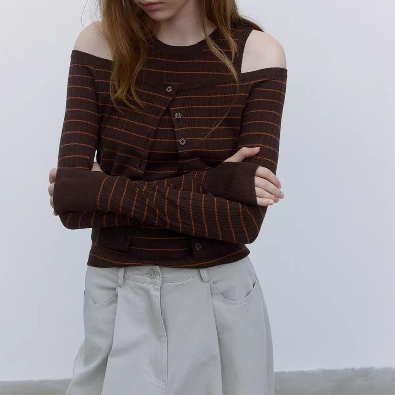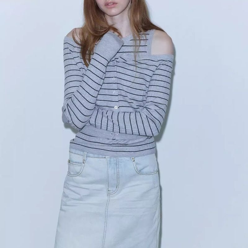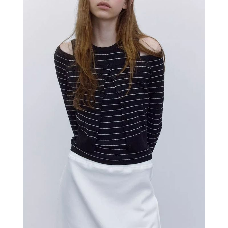 ワイドネックデザインでデコルテを綺麗に見せてくれる、ボーダー柄にニットカーディガン。