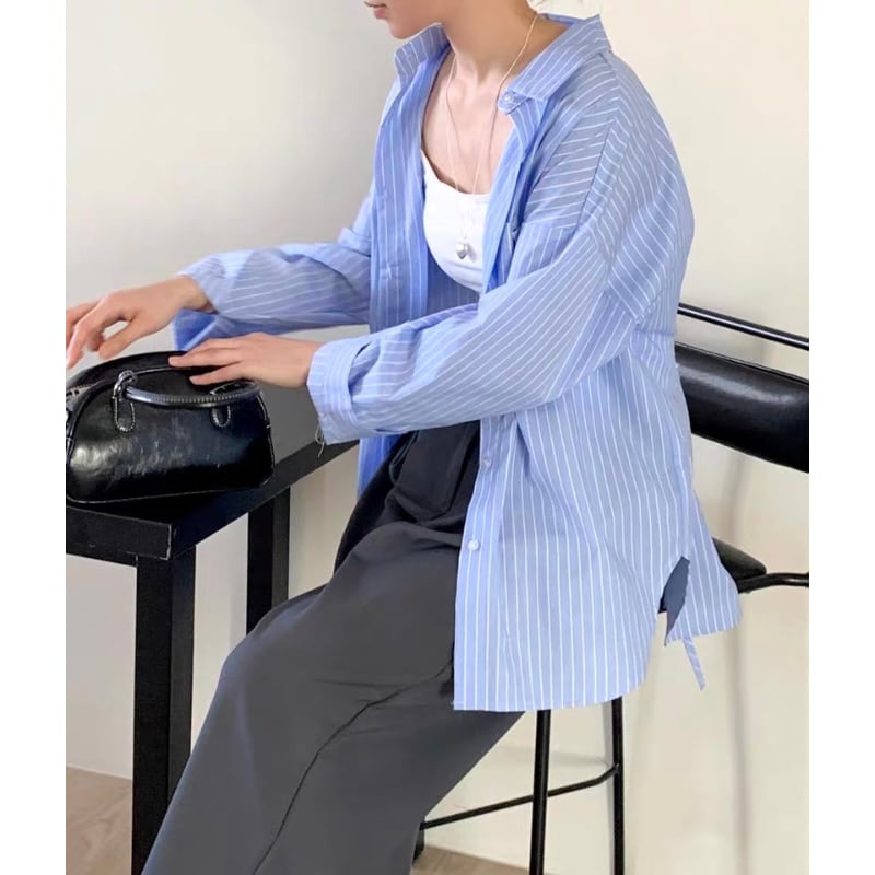 スリットにリボンのバックスタイルが特徴的なストライプシャツ。