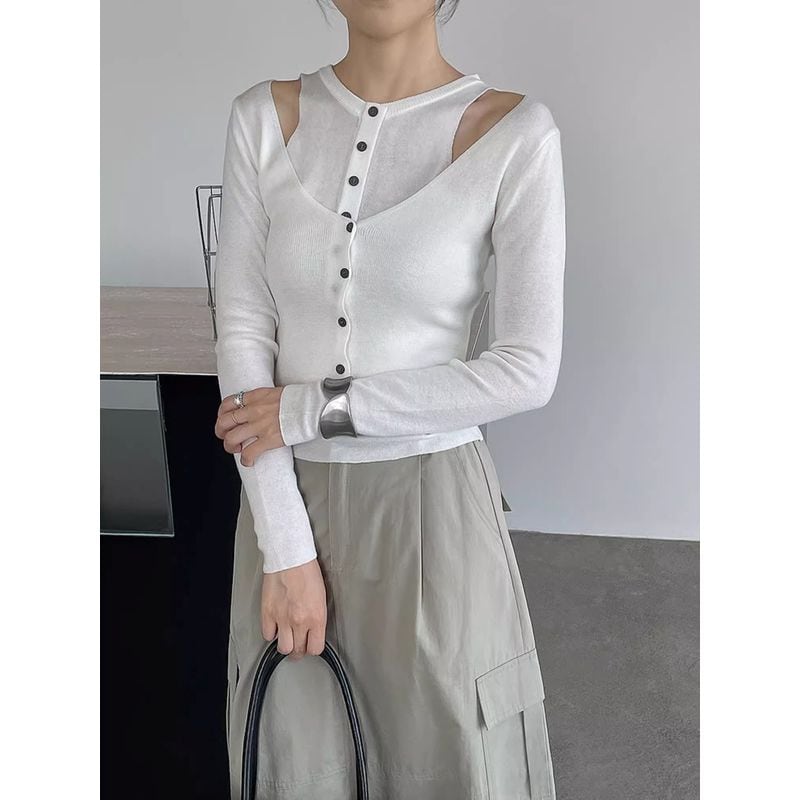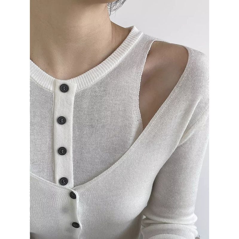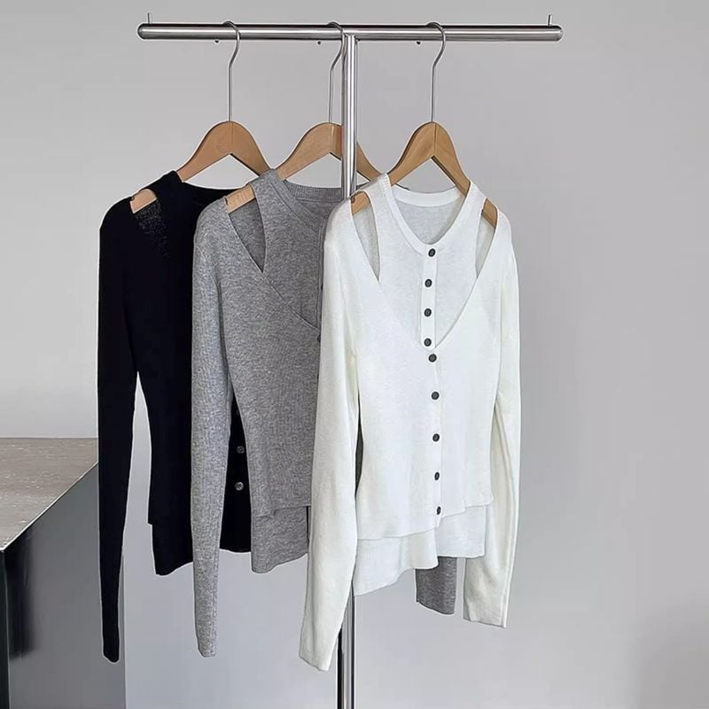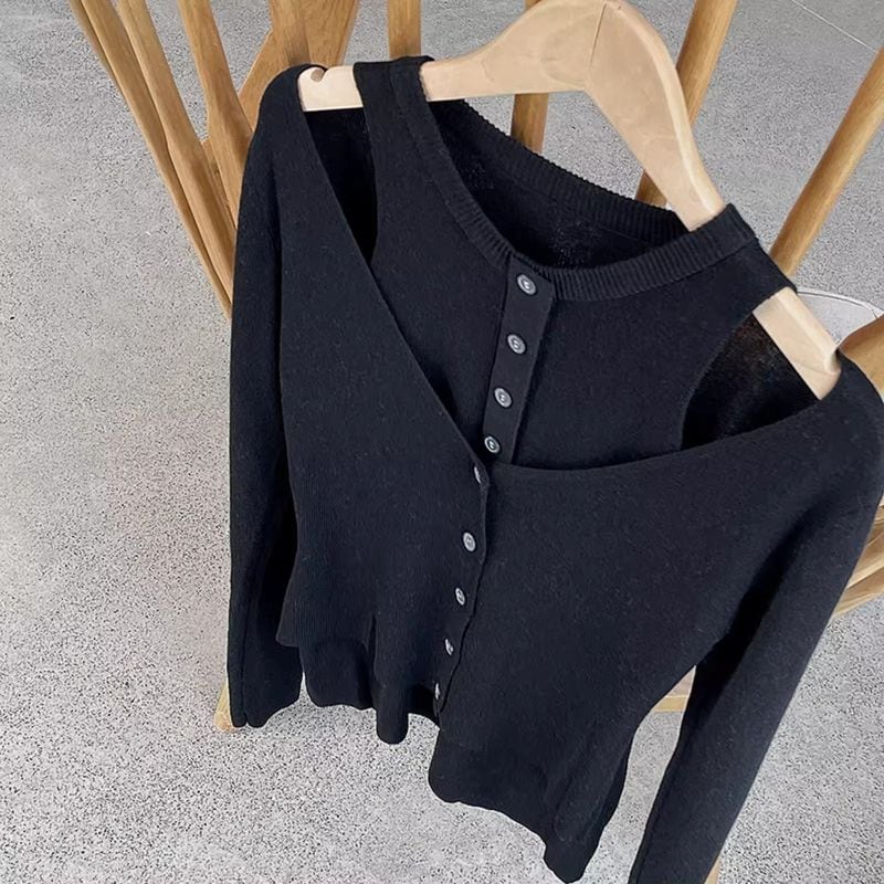レイヤードしてるかのような、肩周りがオープンデザインになった着映えするカーディガン。