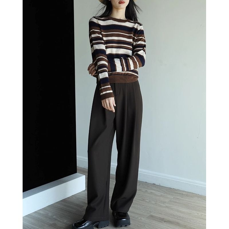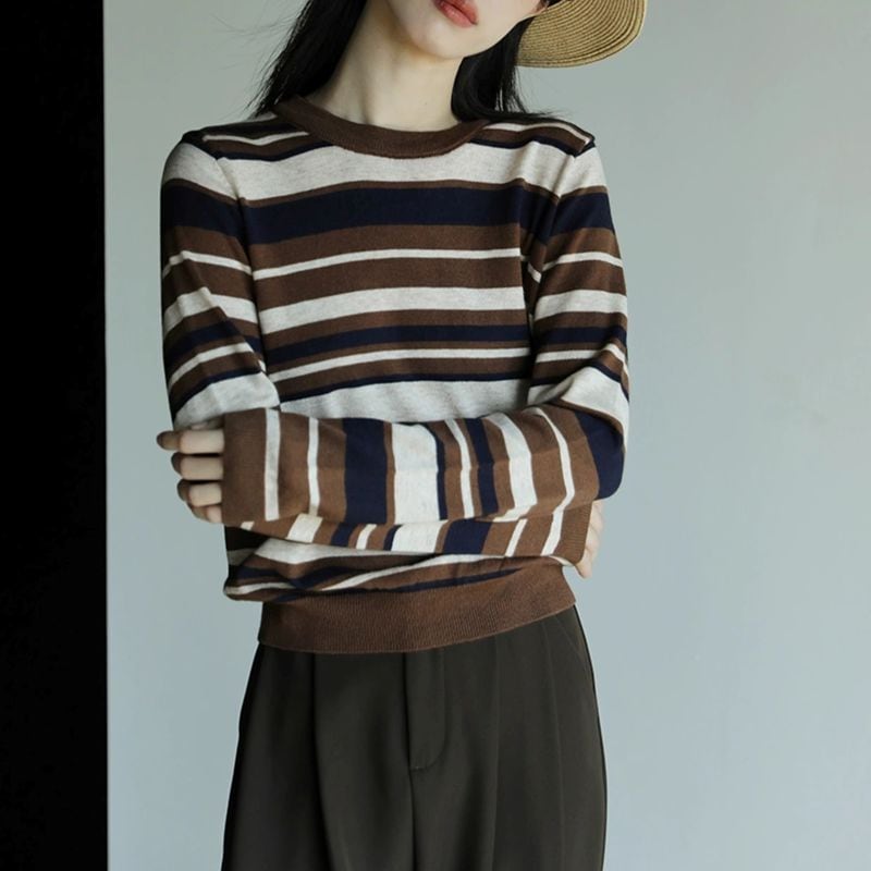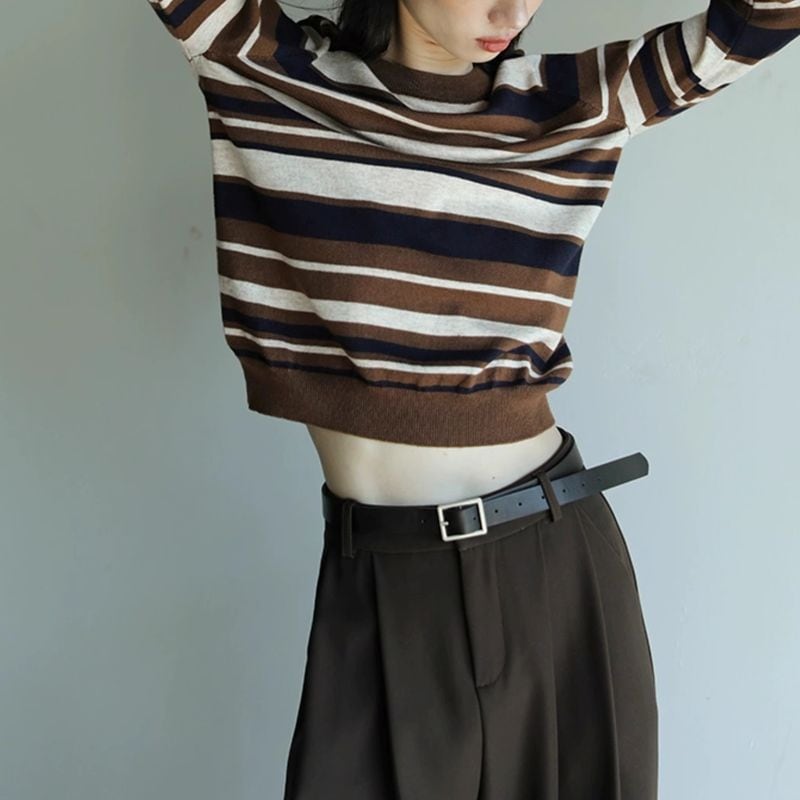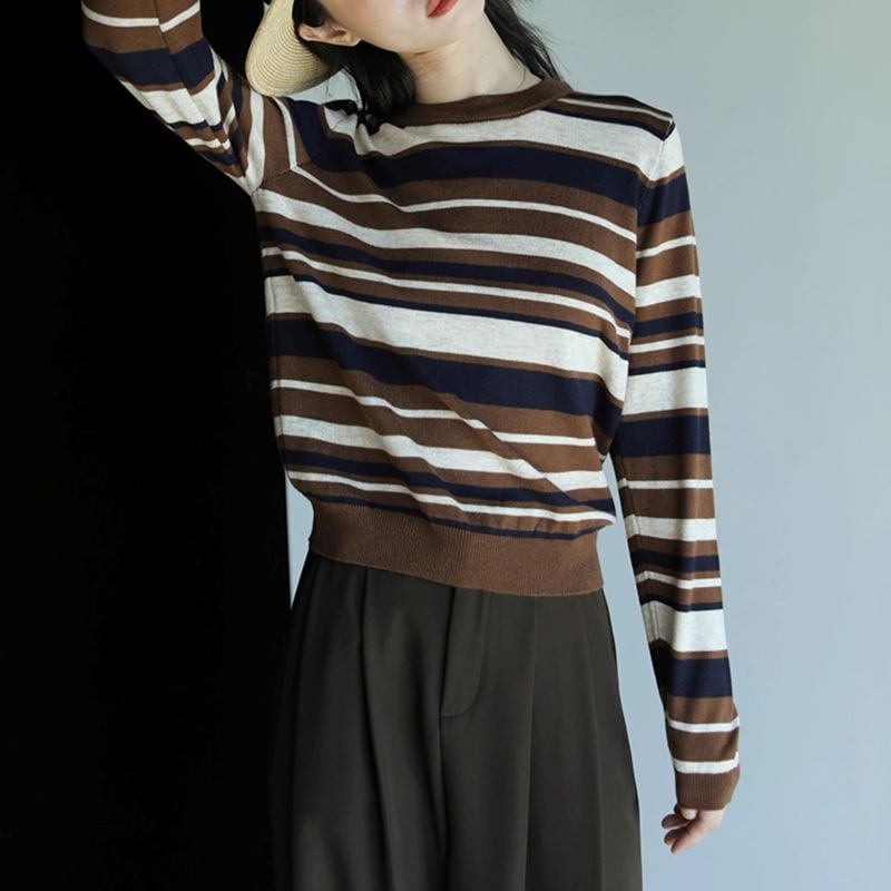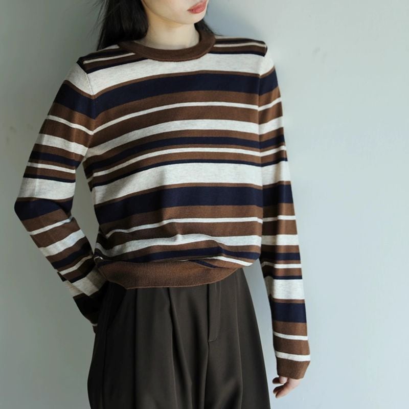 さまざまな太さのボーダー柄がアクセントを与えてくれるニット。