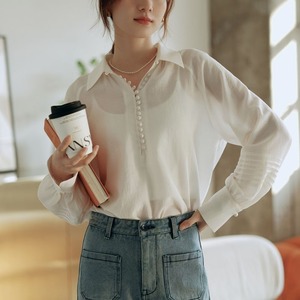 フロントのミニボタンがアクセントを効かせたソフト素材のシャツ。