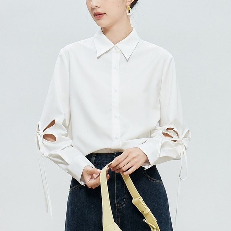スリーブのリボンディティールがポイントのデザインシャツ。