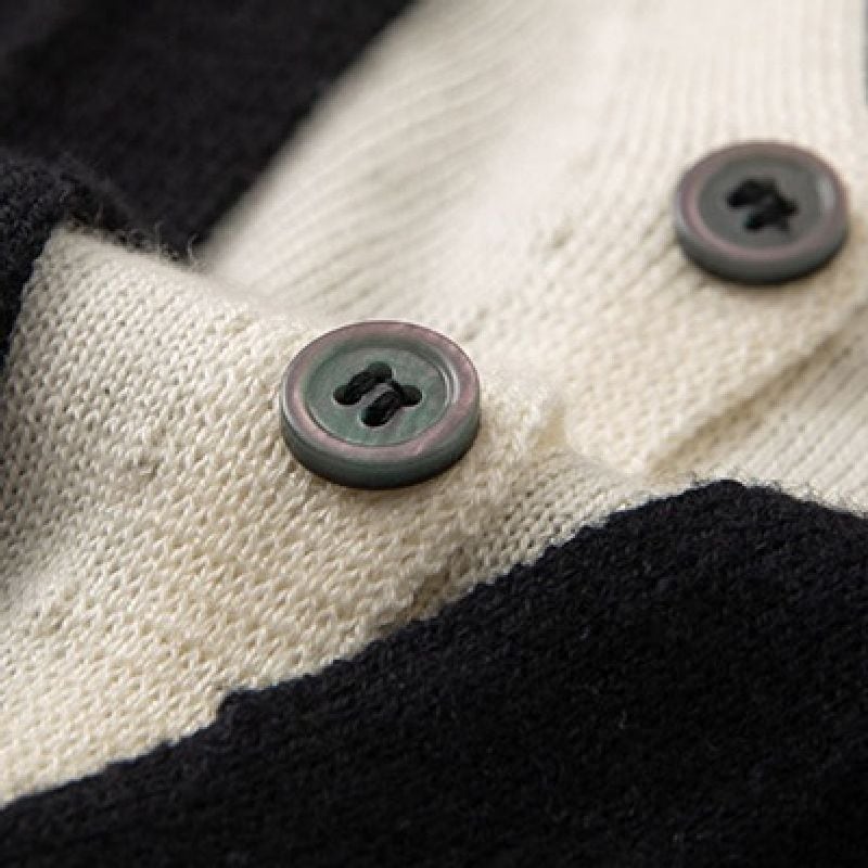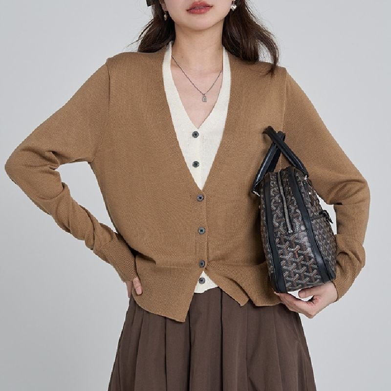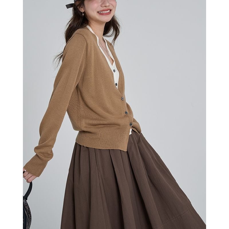 バイカラーが目を引く、まるで2枚を重ねて着ているかのようなフェイクレイヤードカーディガン。