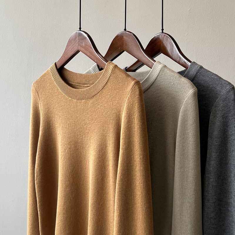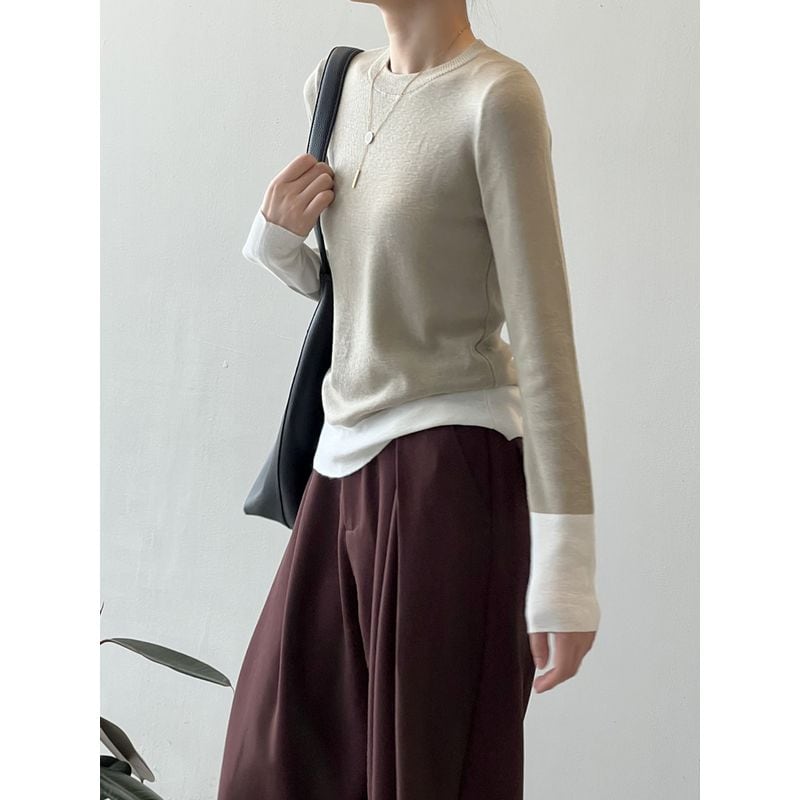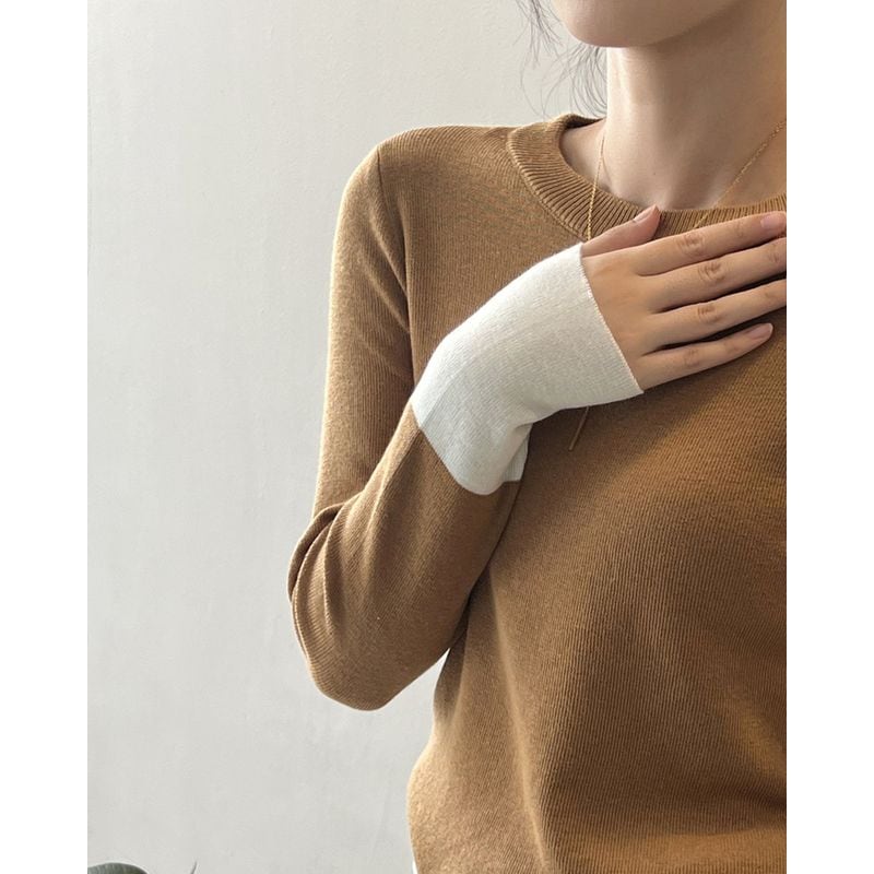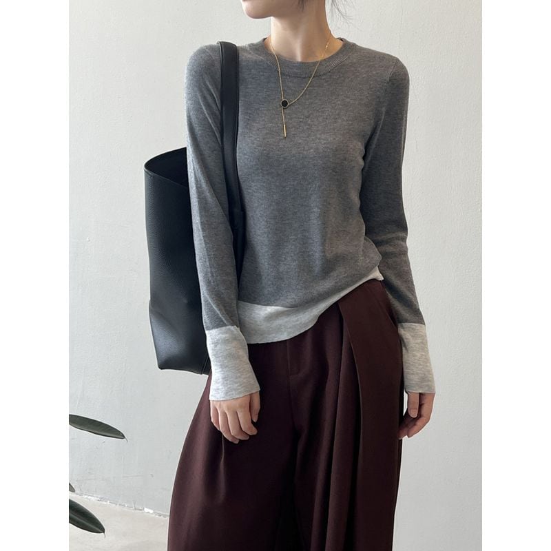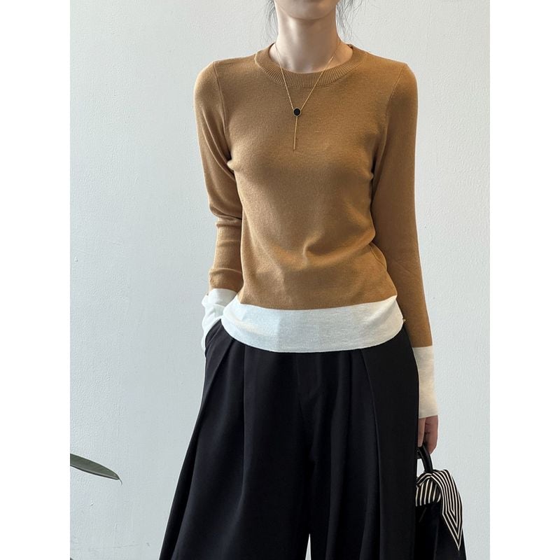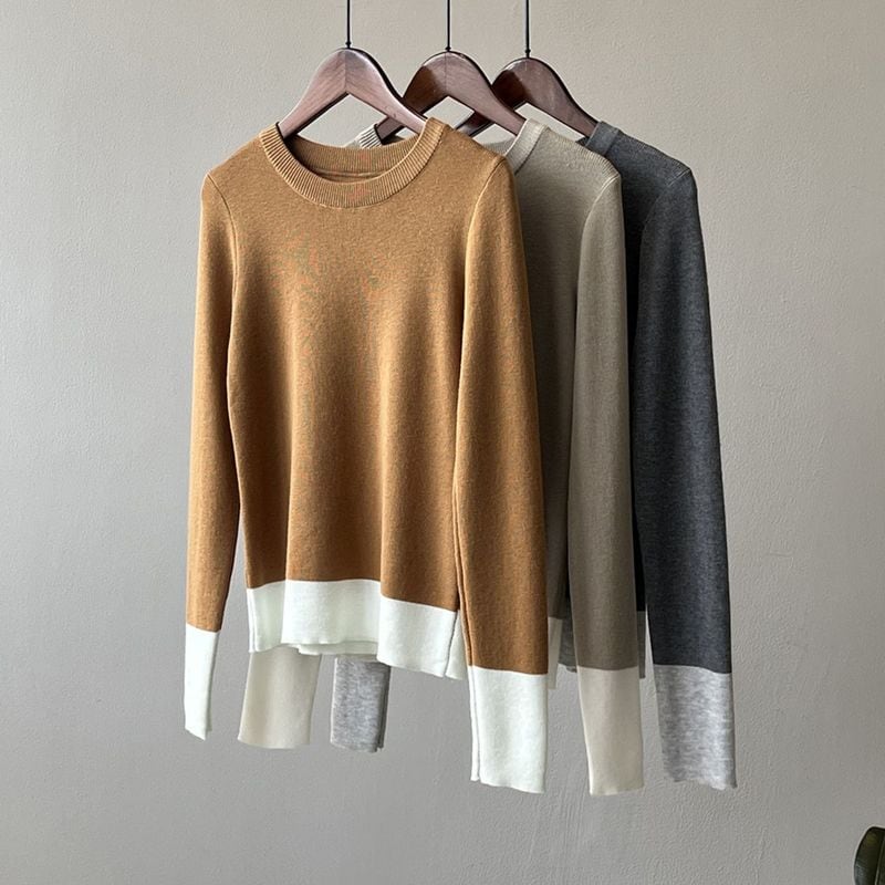 袖口と裾を、バイカラーデザインにした、シンプルで使いやすいシルエットのニットプルオーバー。