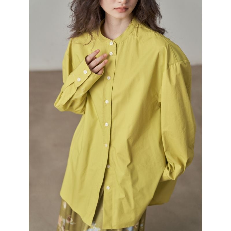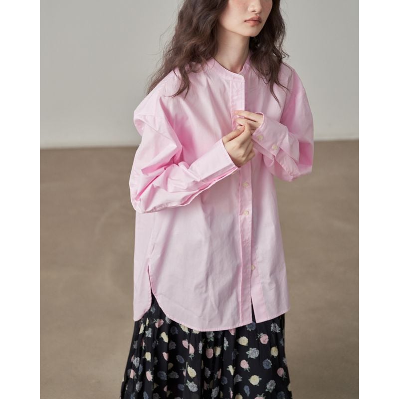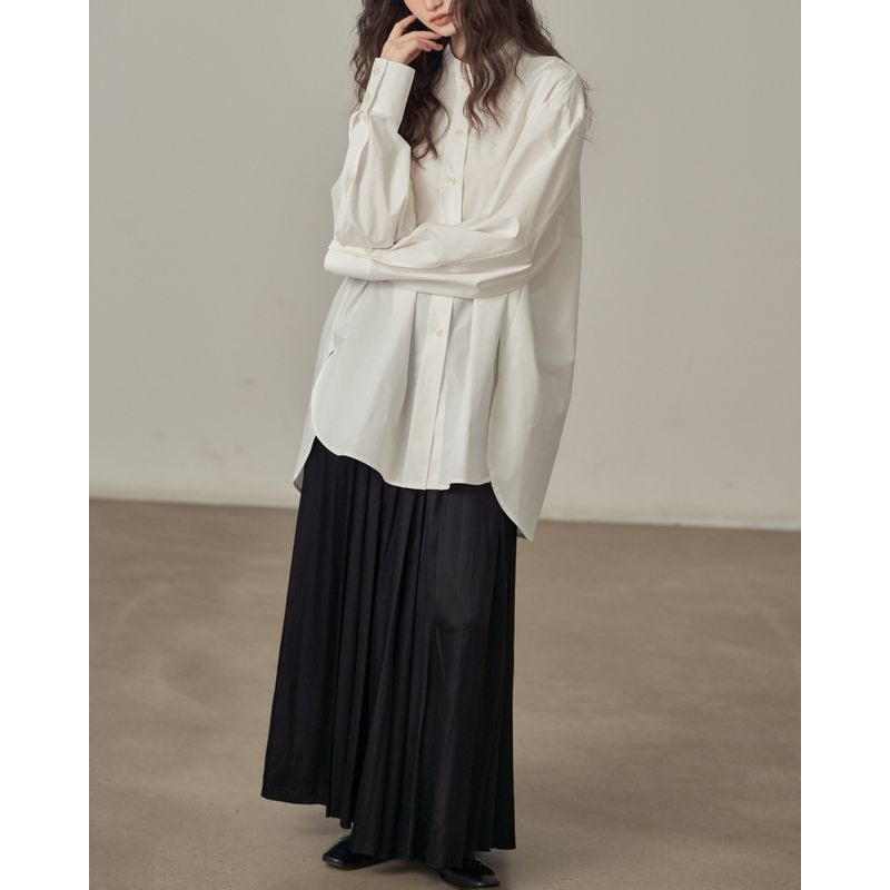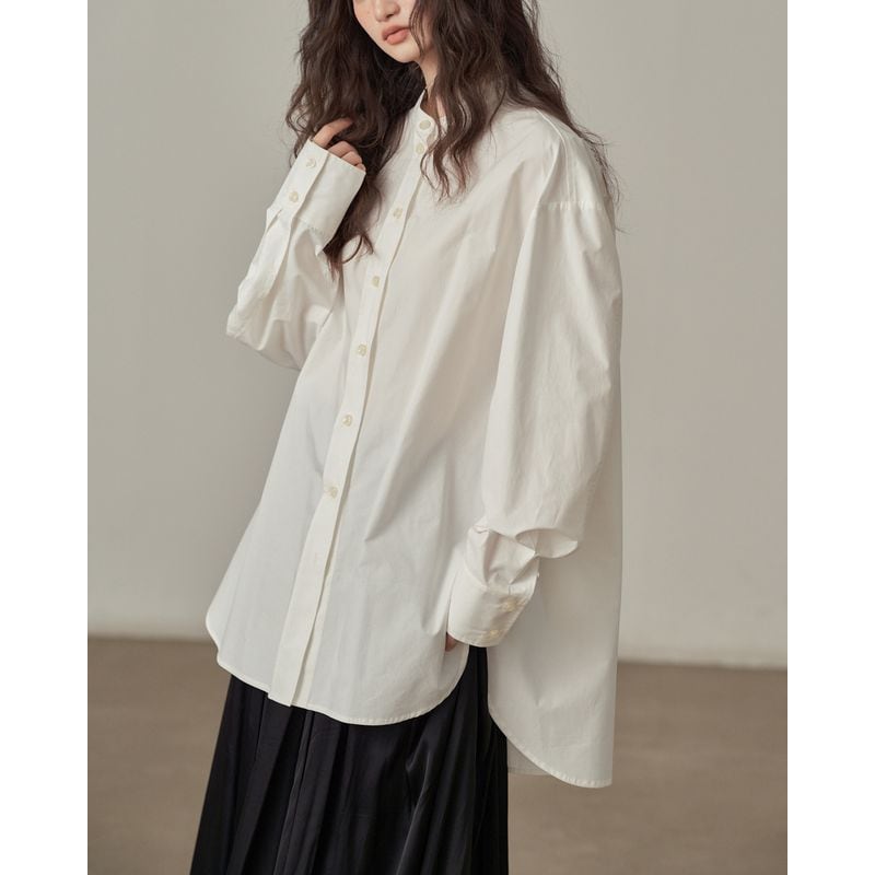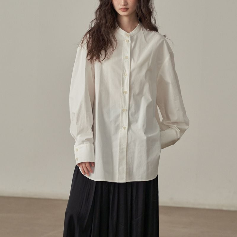 着回し力抜群の、丈感が少し長めのバンドカラーシャツ。